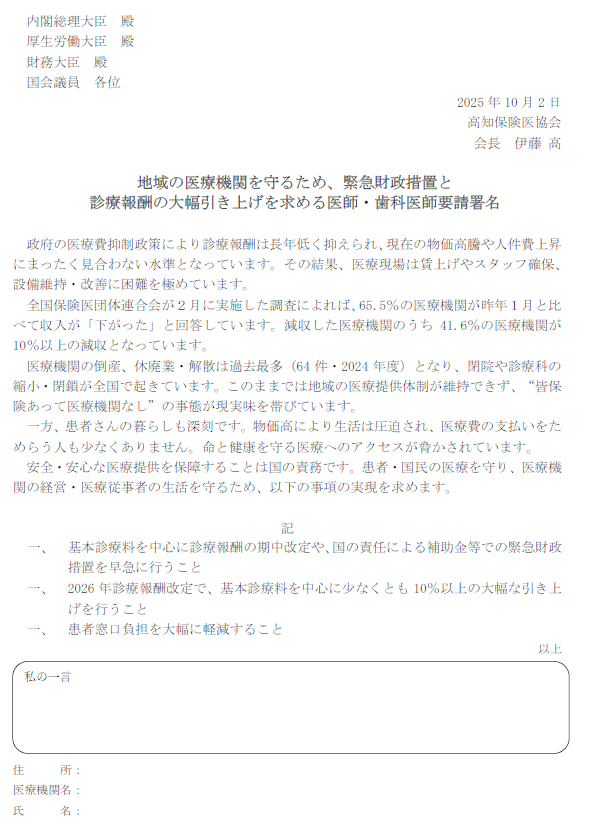 「緊急財政措置と診療報酬の大幅引き上げを求める」署名にご協力を