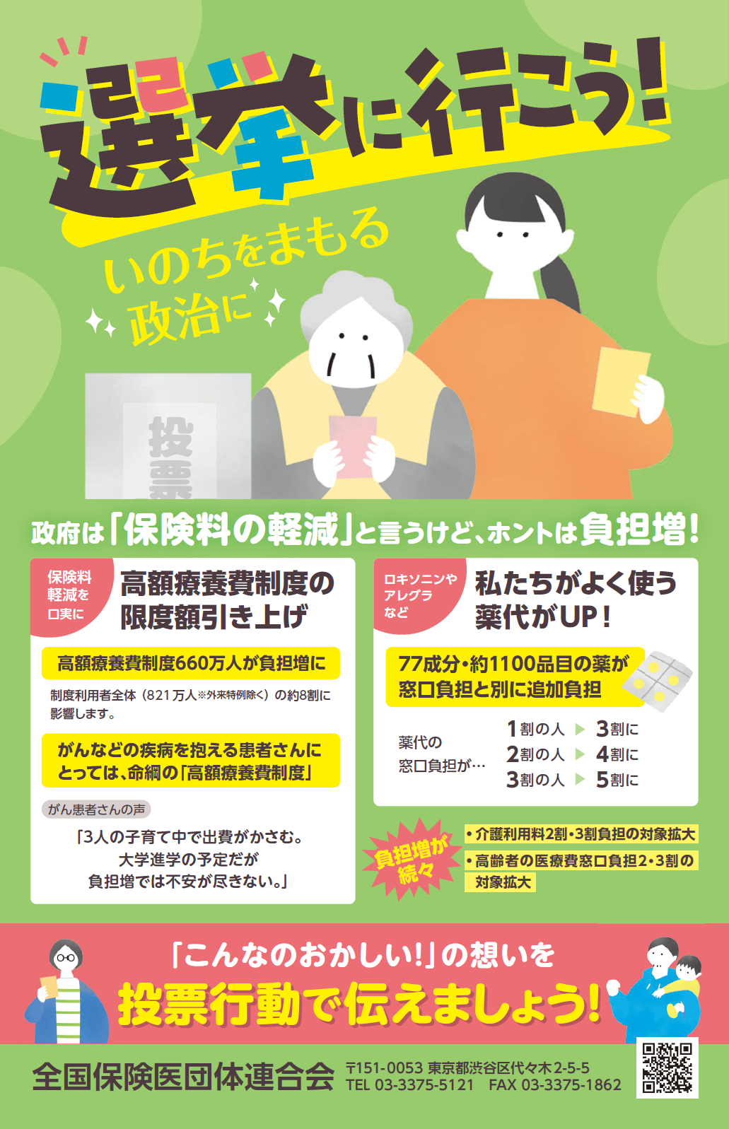 2024年度診療報酬改定は、わずかな「賃上げ」対応やDX推進のための改定がほとんどで、全体ではマイナス改定でした。患者さんのための十分な医療が提供されるためには、診療報酬の大幅引き上げと全体としての社会保障の拡充が必要です。そのための財源はあります。軍事費拡大をしない、大企業の利潤のための政策よりも社会保障を充実させる、そのような政治に転換するよう、選挙に行きましょう。